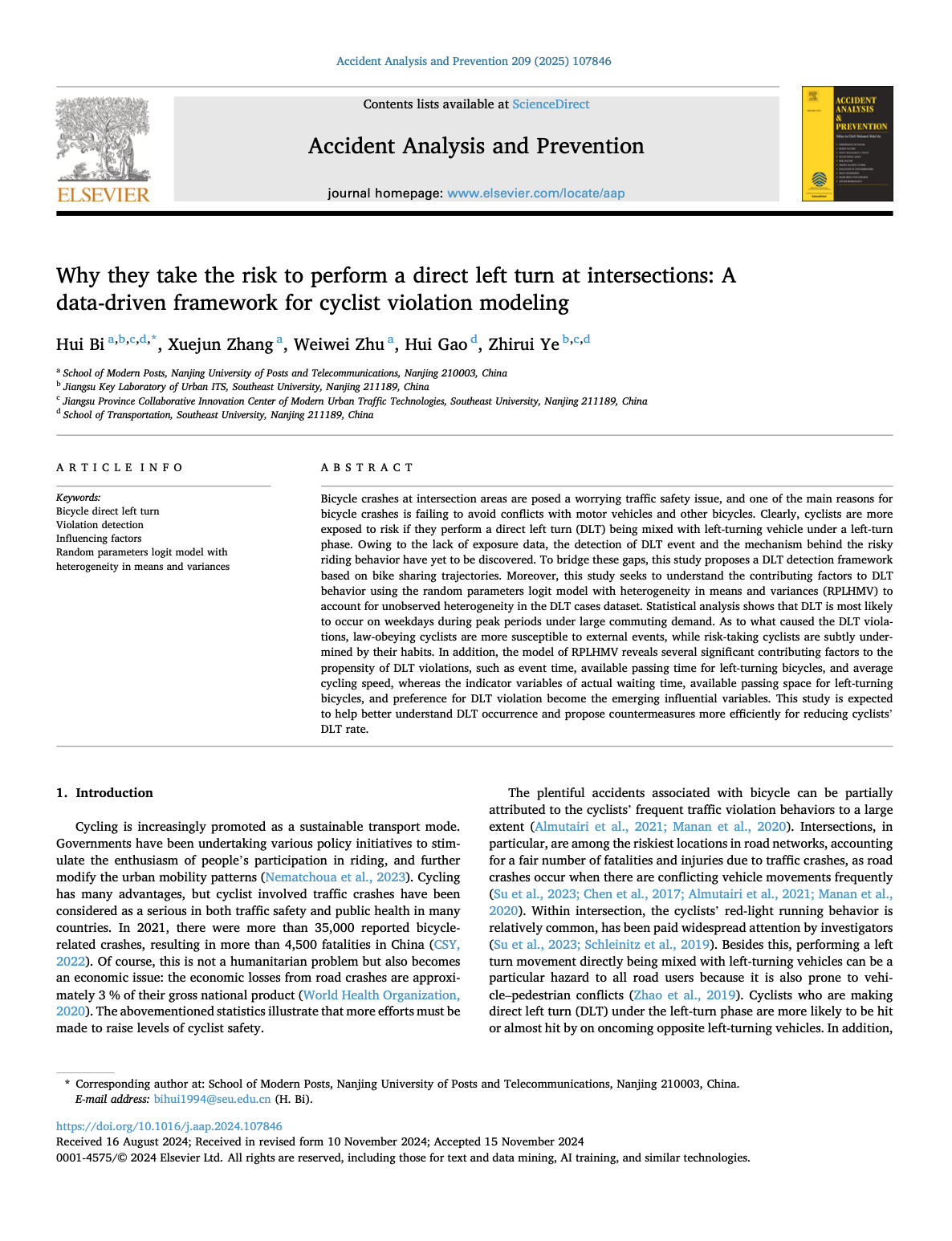 我院畢輝教授在《Accident Analysis and Prevention》發表論文
